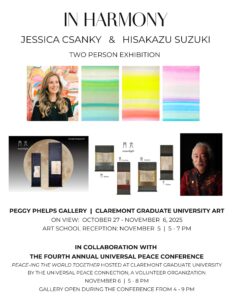 This year’s Peace Conference coincides with the Centennial Celebration of Claremont Graduate University, symbolizing not only a century of learning and creation but also a reaffirmation of our shared humanity—beyond the boundaries of borders and nations. The exhibition reflects this spirit and is an offering of peace through art and cross cultural connection.